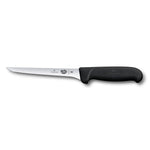 Victorinox Fibrox boning knife with a narrow, 15 cm long blade and a black non-slip ergonomic plastic handle.