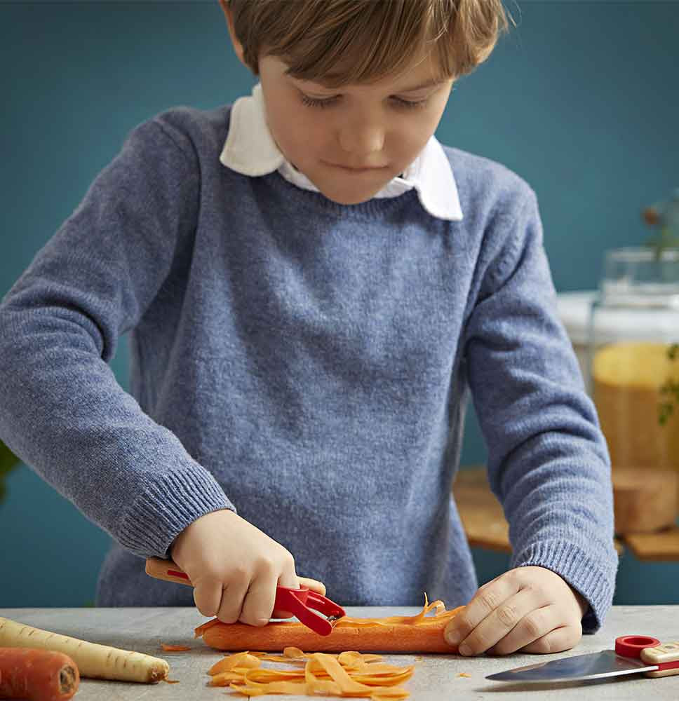 With Opinel, kids can cook: Le Petit Chef collection is the perfect way to teach them. The training ring helps to position their fingers, while the finger protector protects the hand holding the food in place.