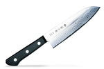 Tojiro DP Damascus Santoku with a 17 cm long blade, riveted black handle.