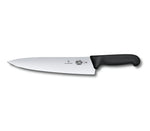 Victorinox Fibrox Chef's Knife with a straight edge, narrow 25 cm long blade and black synthetic ergonomic handle.