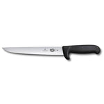 Victorinox Fibrox paring knife with a straight edge 22 cm long blade and a black handle with a safety finger guard.