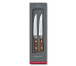 Victorinox Grand Maitre Wood 2-piece Steak Knife Set with 12 cm long serrated blade and wooden handle, in a gift box.