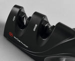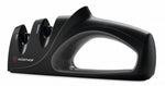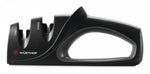 Place the sharpener on a flat work surface. Hold the sharpener in one hand and the knife in the other. Insert the knife blade fully into the slot with the sharpener at a 90° angle. Apply moderate downward pressure on the blade while pulling the knife towards you in the appropriate groove. Repeat this process, always pulling the blade from the handle to the tip (never back and forth) in the carbide or ceramic slot.